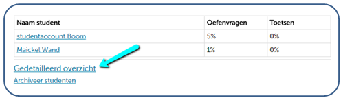 U ziet eerst een progressieoverzicht van de studenten die uw docentcode hebben ingevoerd bij hun account. In dit overzicht staat welk percentage van alle oefeningen de student heeft gemaakt. Zo krijgt u een globale indruk van de voortgang door de hele cursus.